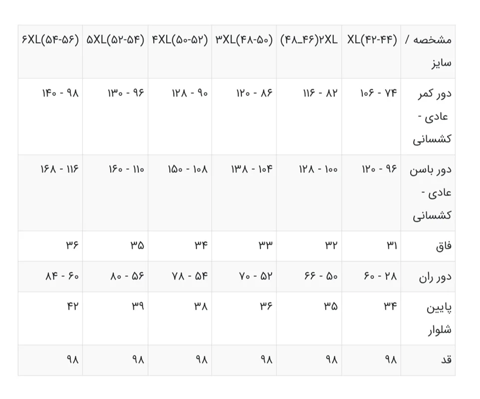 | مشخصه /سایز | XL(۴۲-۴۴) | 2XL(۴۶ـ۴۸) | (۴۸-۵۰)3XL | (۵۰-۵۲)4XL | 5XL(۵۲-۵۴) | 6XL(۵۴-۵۶) |